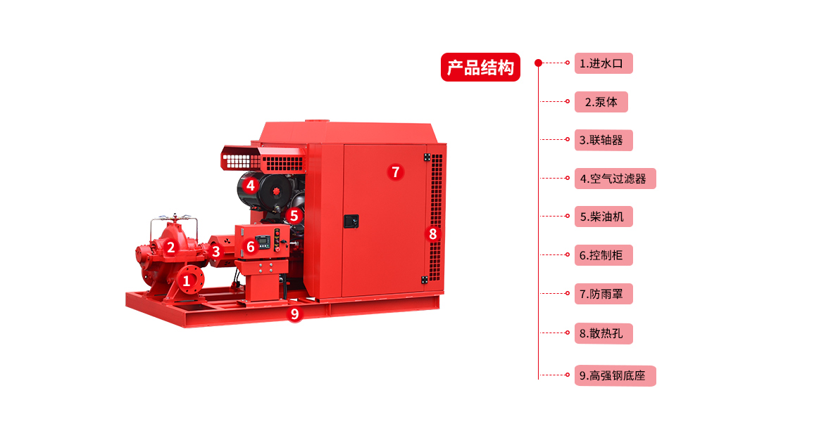 柴油機中開泵柴油機消防水泵是貝德科技集團有限公司嚴格按照標準GB6245消防泵性能要求和試驗方法等標準研制開發的一種新型消防設備,該系列設備按所配用的消防泵(單級單吸式、單級雙吸式、節段多級式)可分為XBC-IS、XBC-S、XBC-D等三個子系列,設備壓力、流量范圍廣,其應用幾乎能滿足消防所需的各種場合。