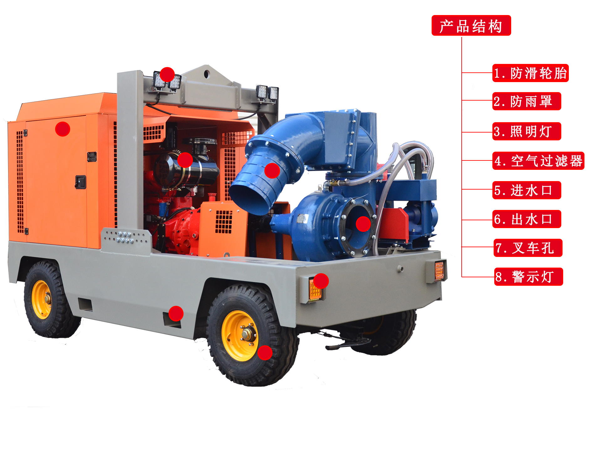 1. 結構緊湊:開架式四輪移動排澇泵車設計合理,結構緊湊,體積小,移動方便,能夠在狹窄或復雜的環境中靈活操作。